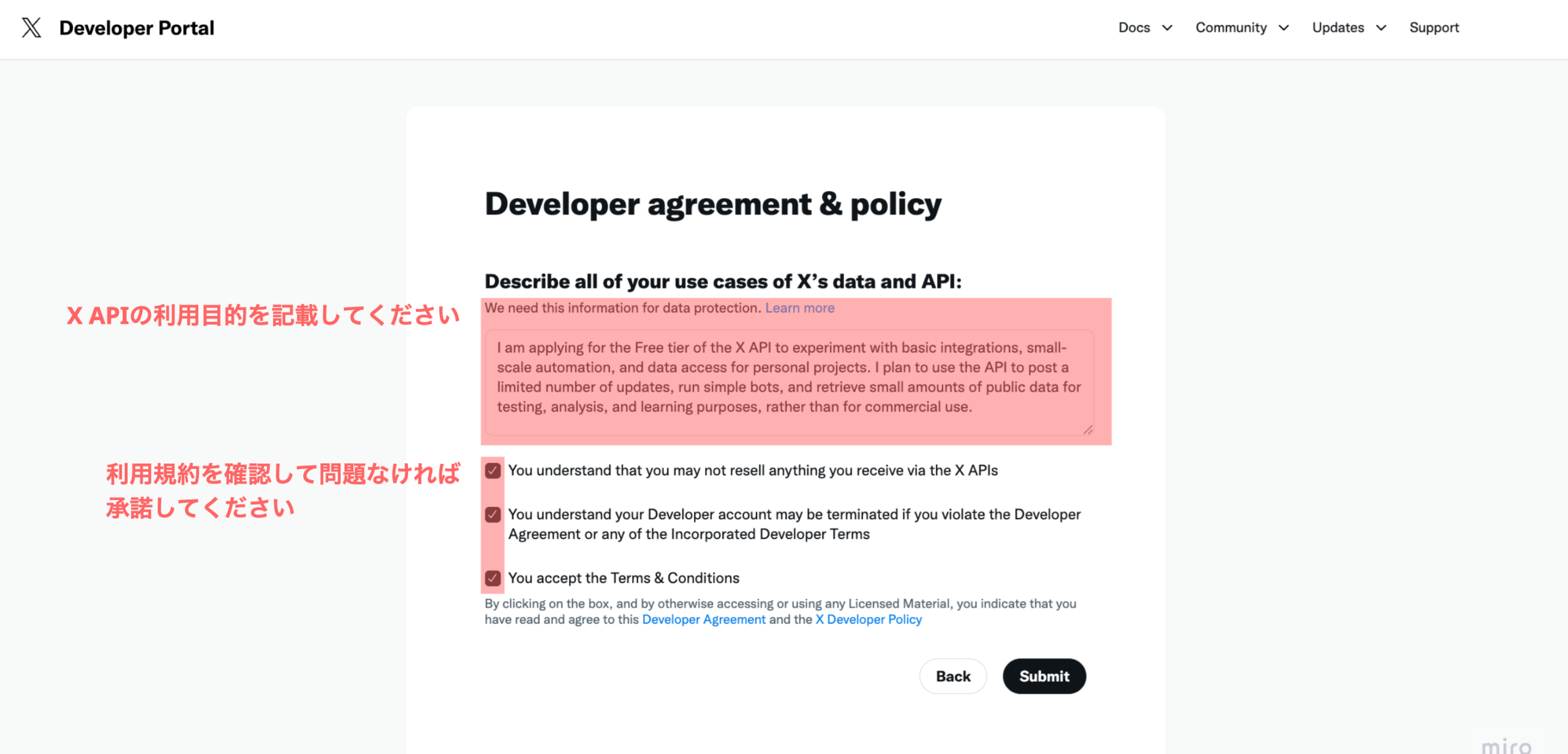 ステップ2:利⽤⽬的や規約へのチェックボックスに承諾をつけます。X APIに関する詳しい説明を知りたい場合は、公式ドキュメントを参照してください。