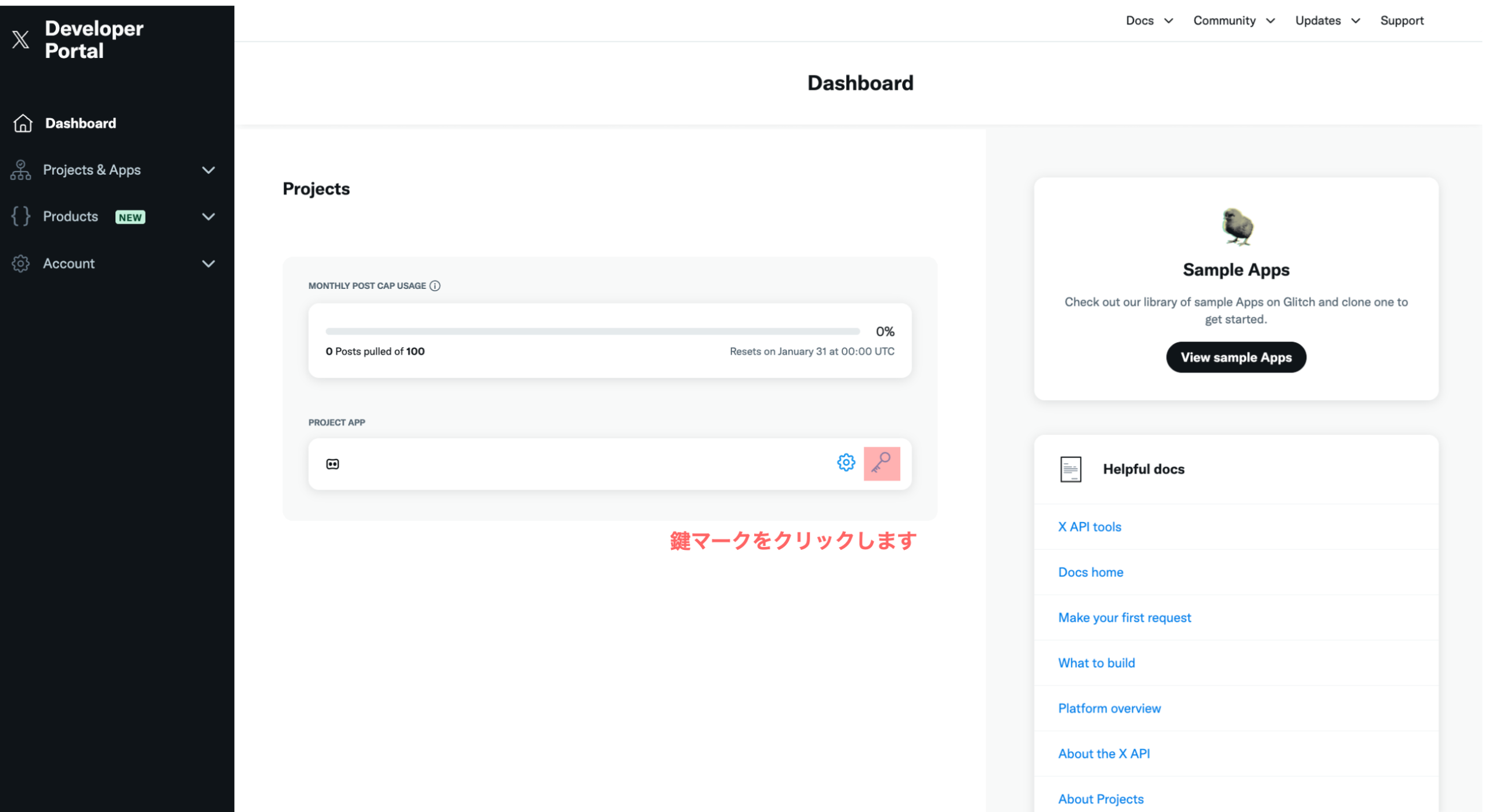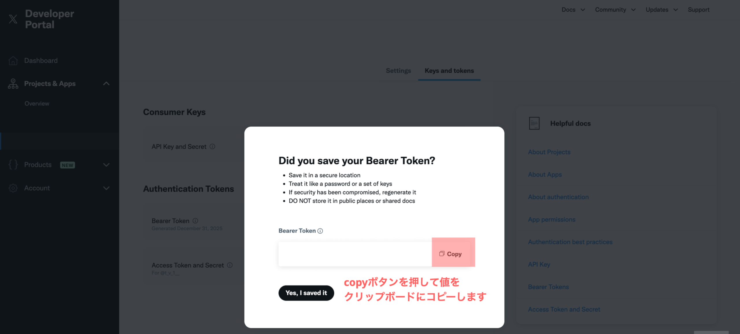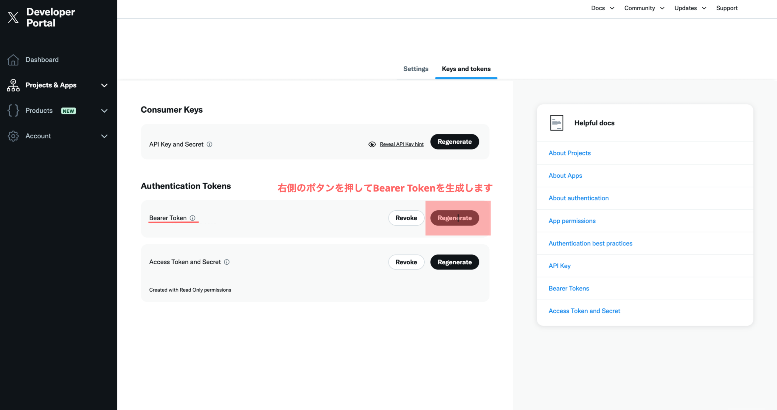 続いて、X APIにアクセスするための鍵であるBearerTokenを取得します。