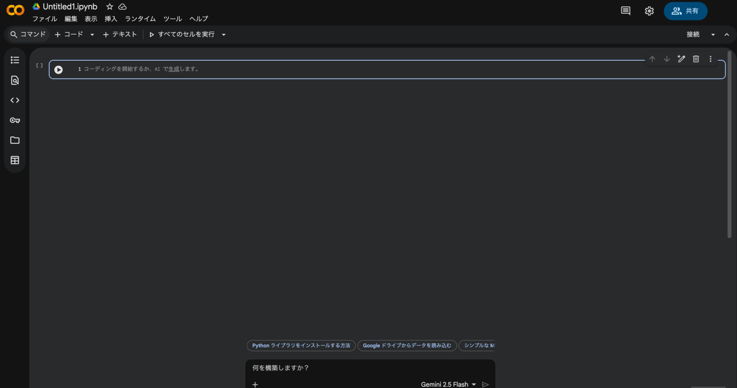 これで、ブラウザ上で Python コードを実⾏できる空のノートブックが⽤意できました。