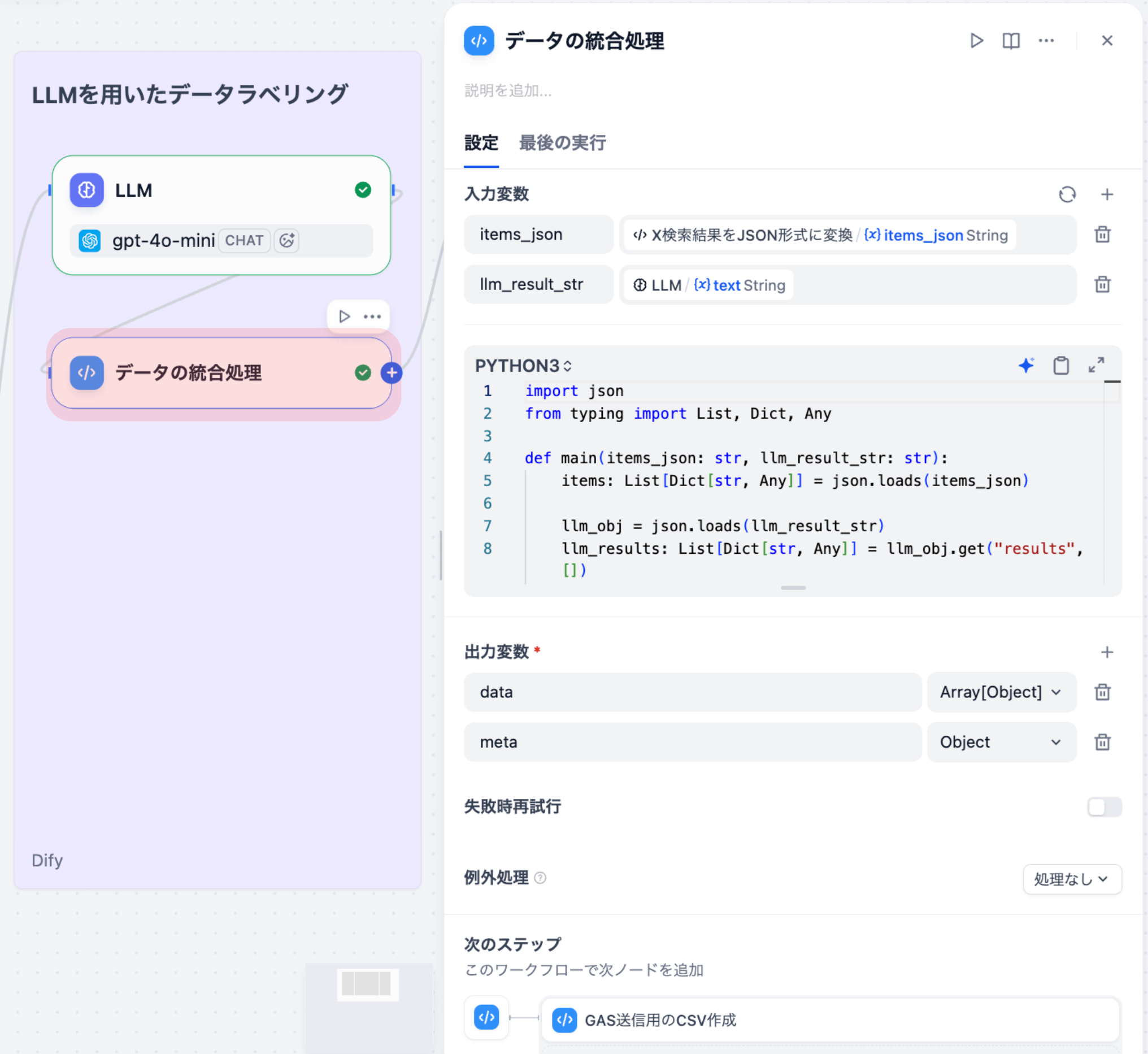 - データ統合: tweet_idをキーにLLM結果と元データをマージ
