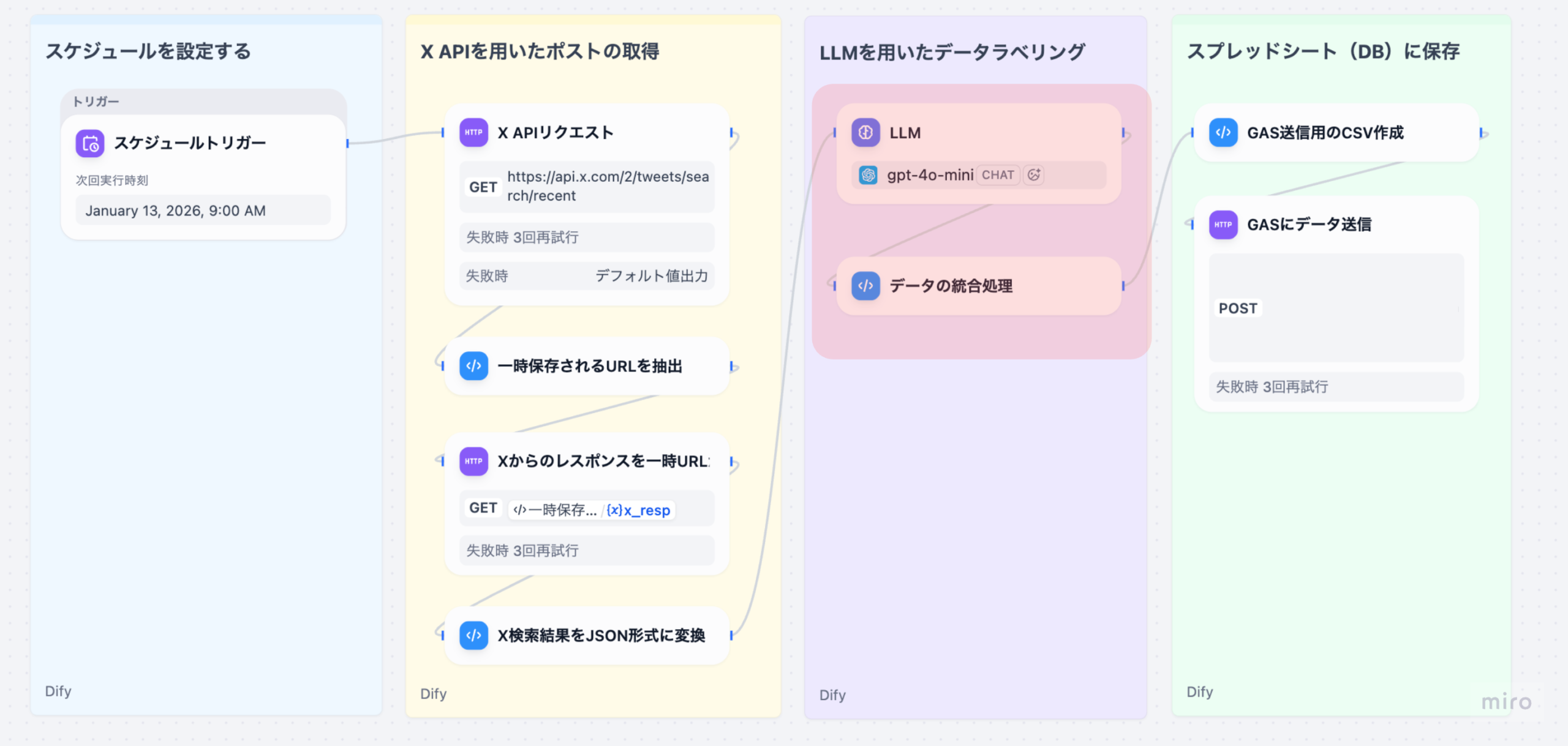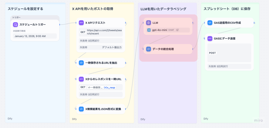 Part 2の復習: 前回の記事では、DifyのワークフローでX APIからツイートを取得し、構造化データに変換するまでの処理を解説しました。具体的には、以下のノードを実装しました。